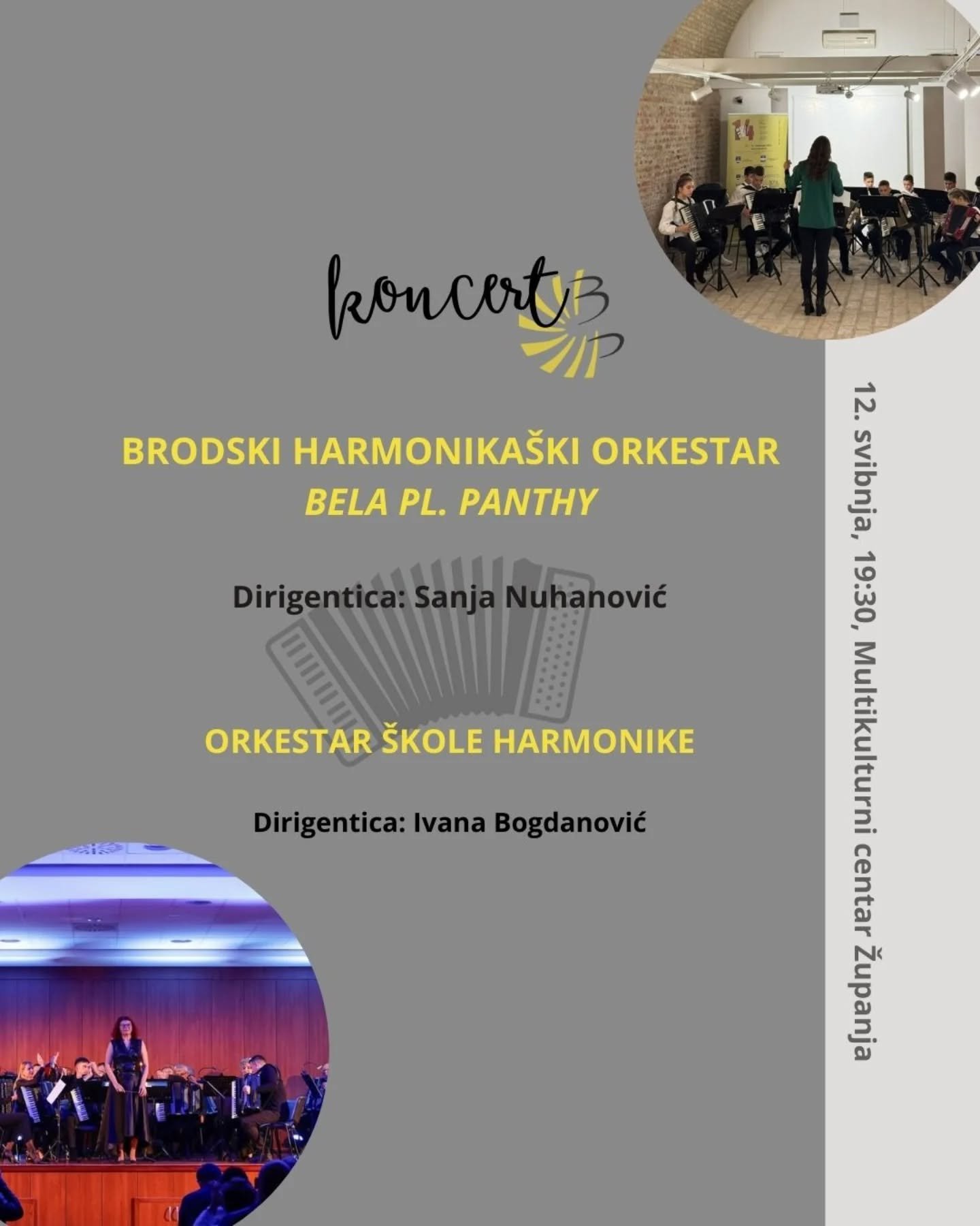 U ponedjeljak, 12. svibnja 2025., u Multikulturalnom centru u Županji održat će se zajednički koncert Brodskog harmonikaškog orkestra “Bela pl. Panthy” i Orkestra Škole harmonike.
